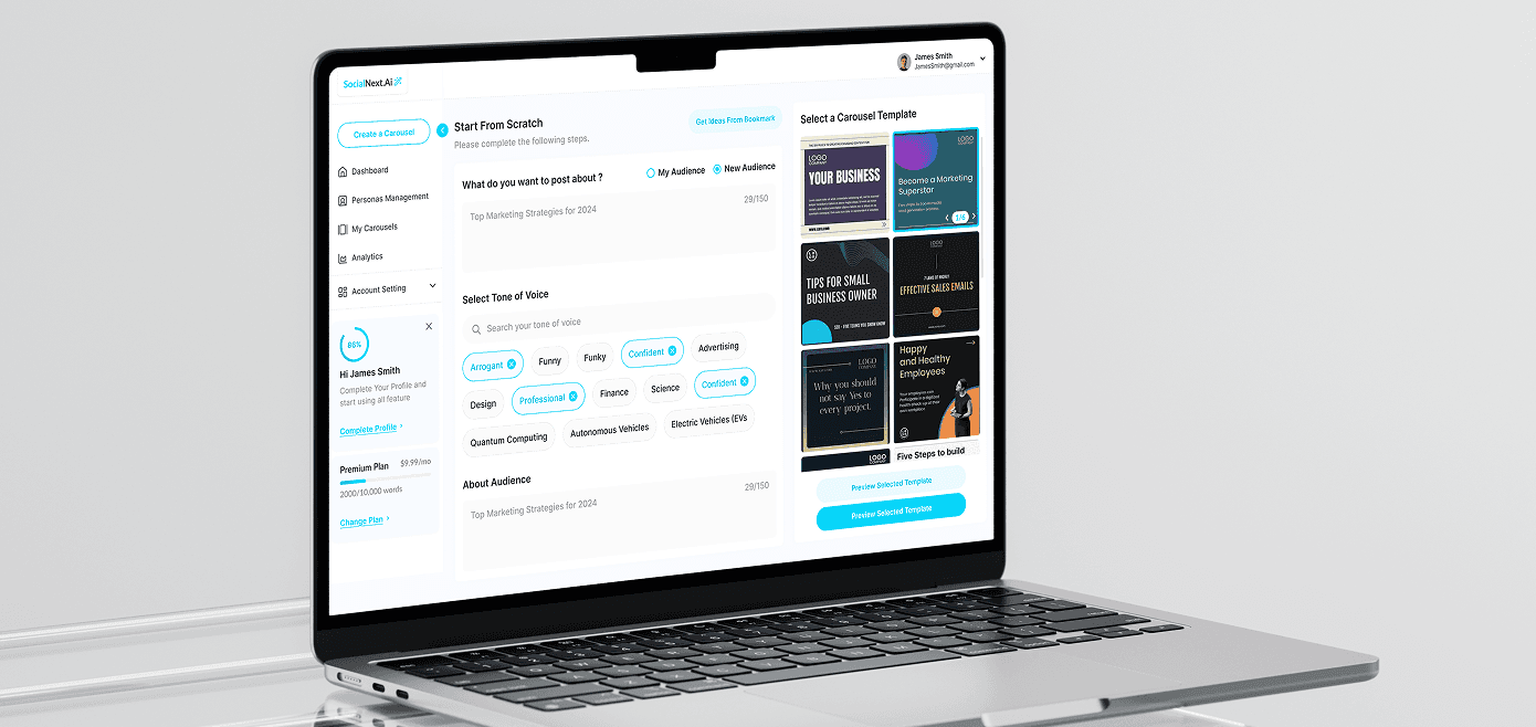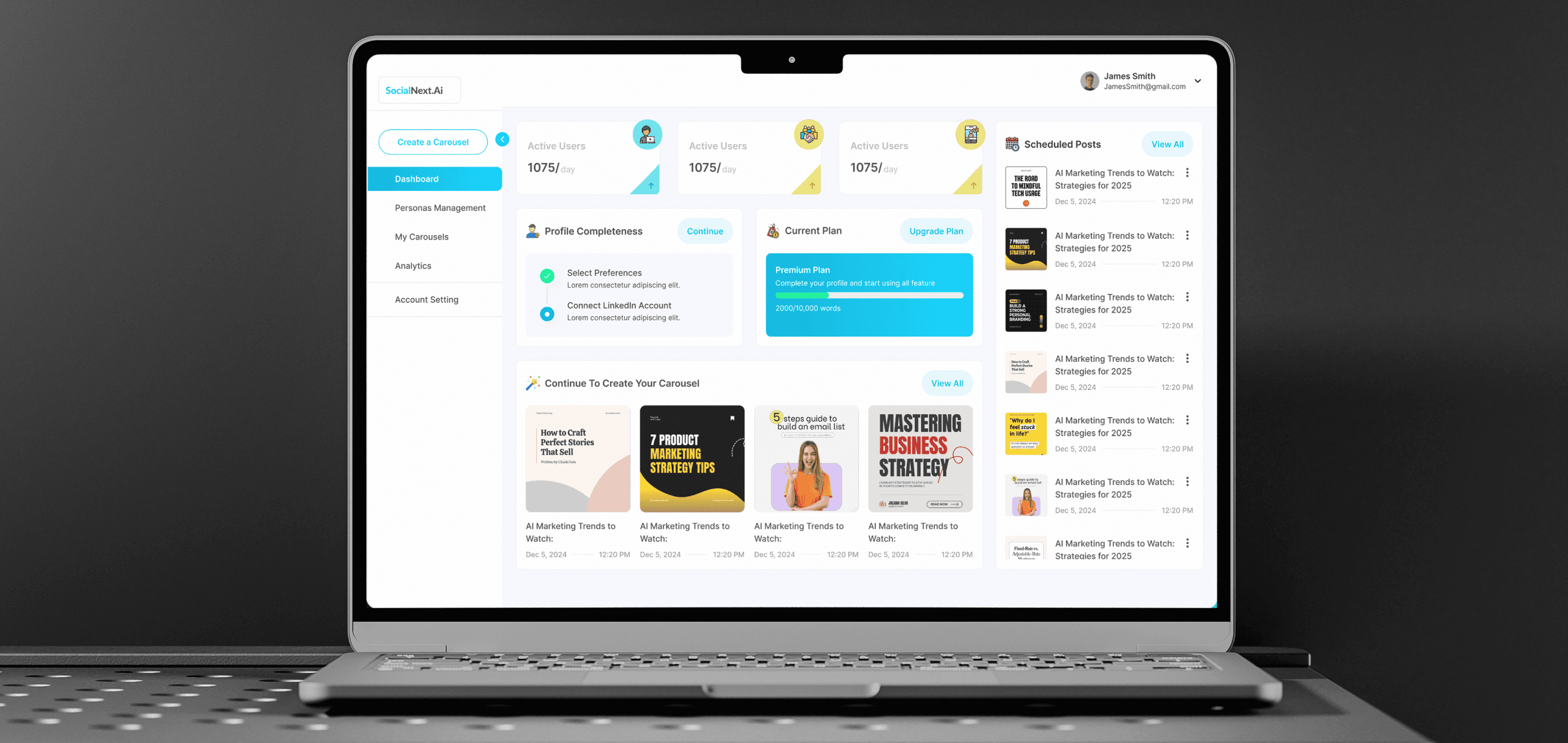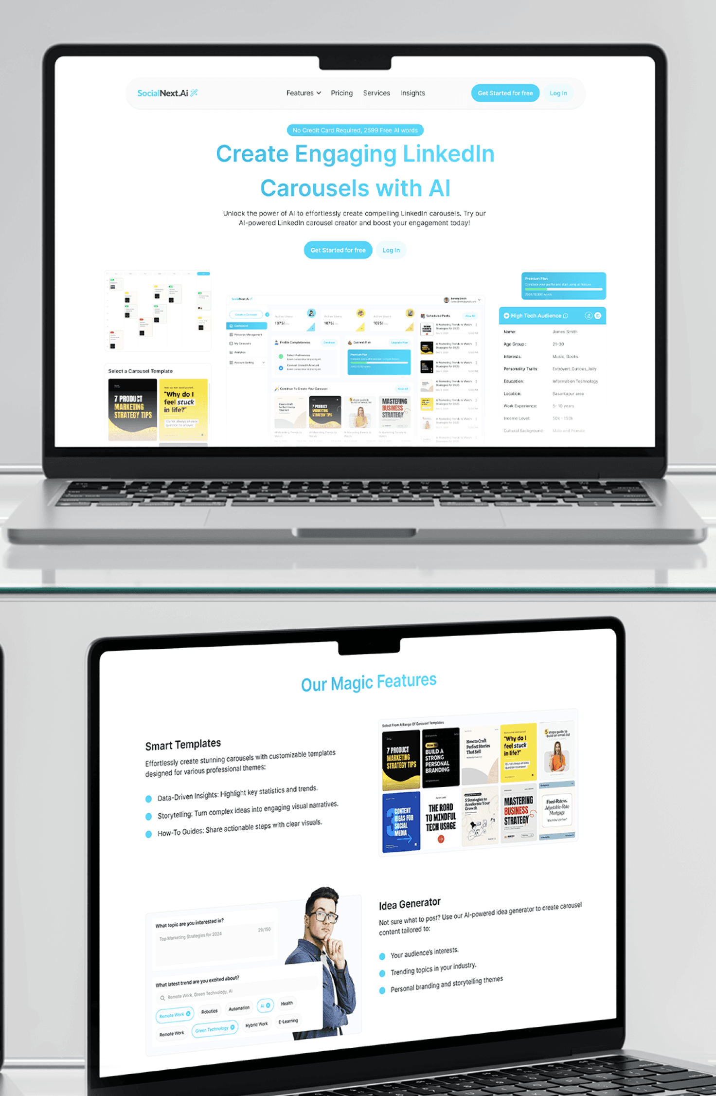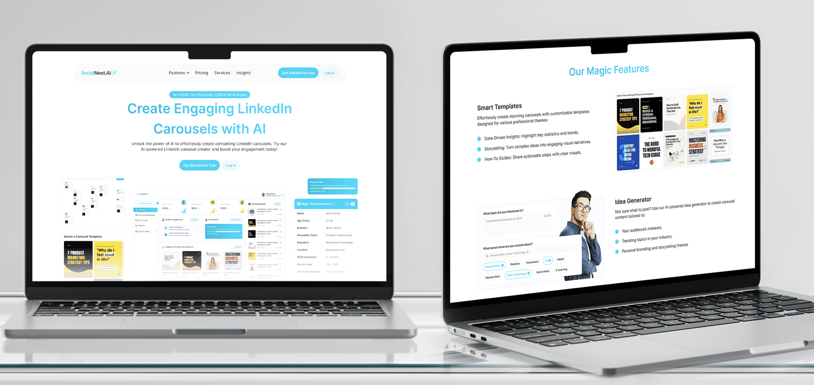 Social Next AI is a web and mobile application designed to help professionals create LinkedIn posts—primarily carousel posts—using AI. The platform integrates content generation, an intuitive carousel builder, and scheduling tools to reduce the effort and time required for busy professionals and non-designers to share content consistently.