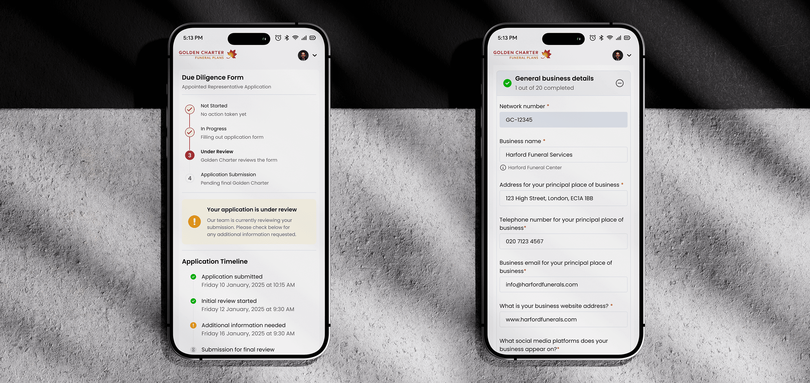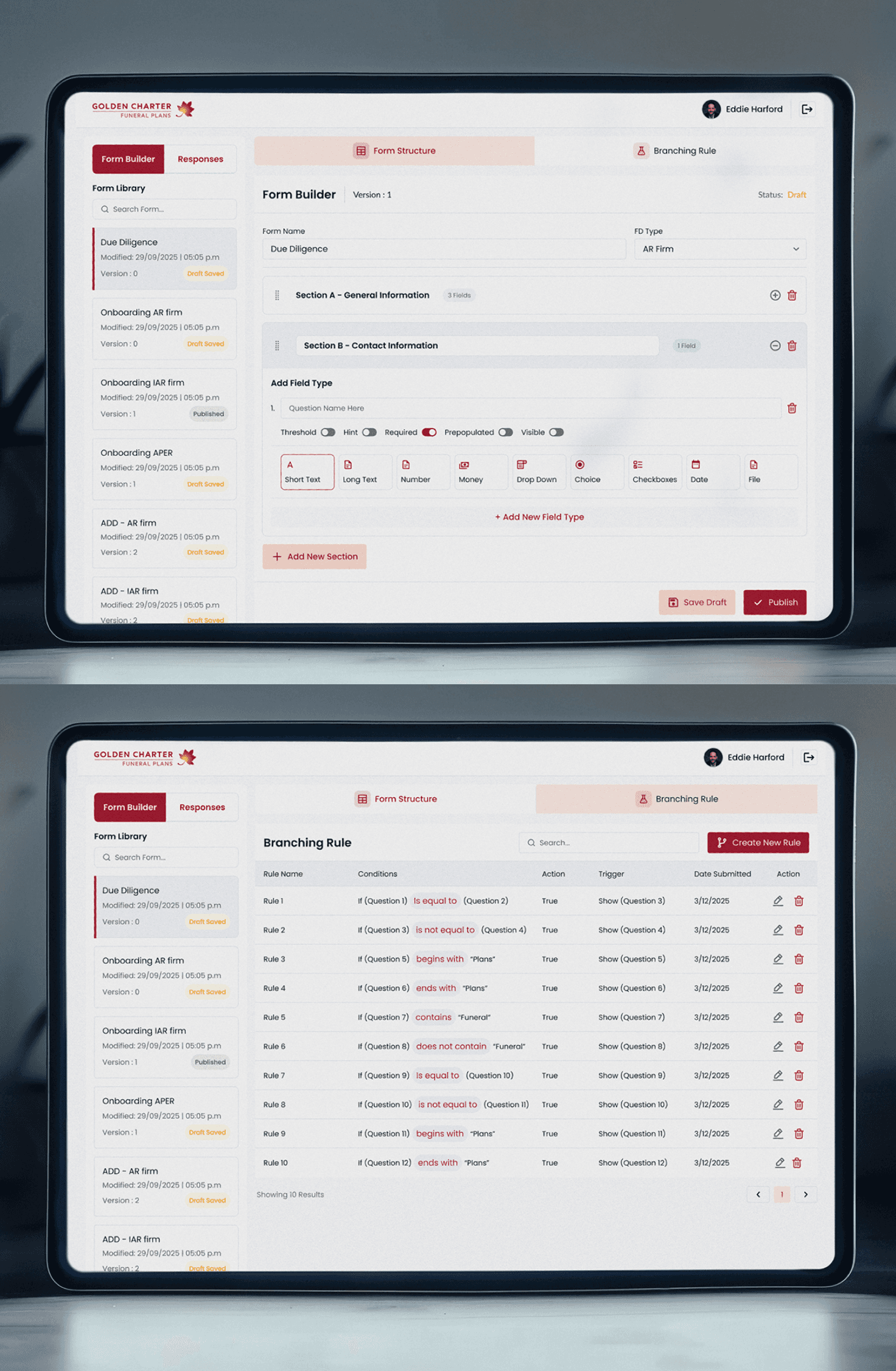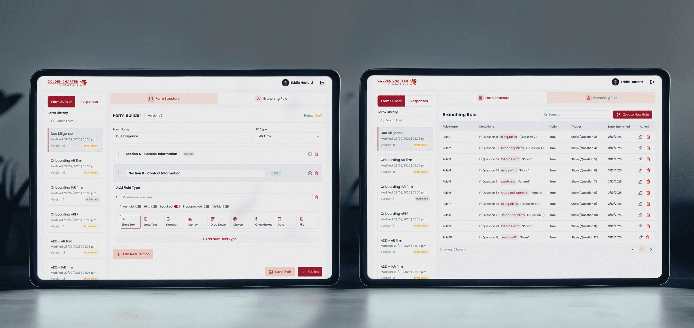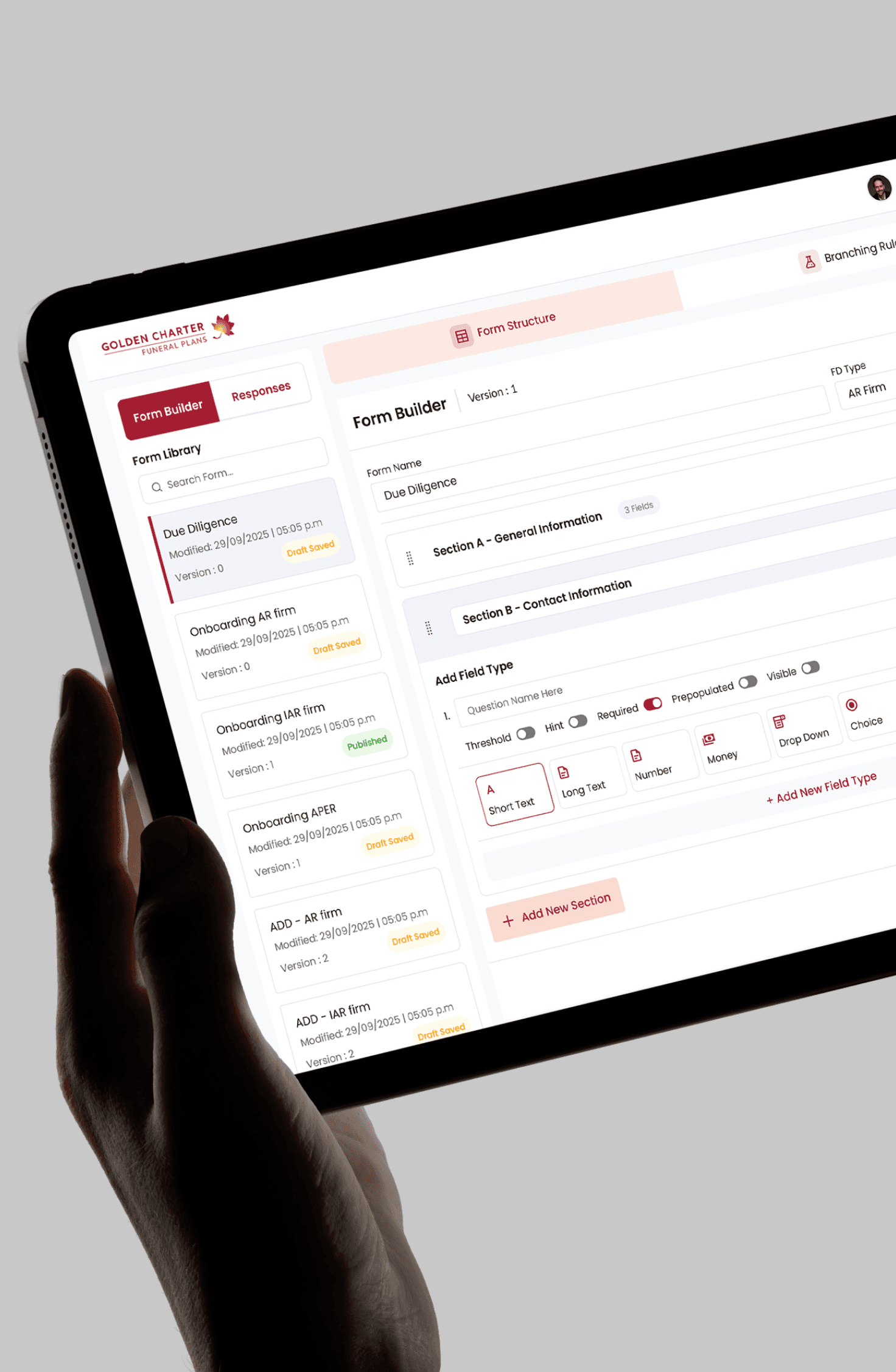 Designed a custom Form Builder Tool for Golden Charter, a leading funeral plan provider, to replace manual paperwork and streamline partner onboarding. The solution modernized compliance processes, reduced errors, and improved staff adoption.