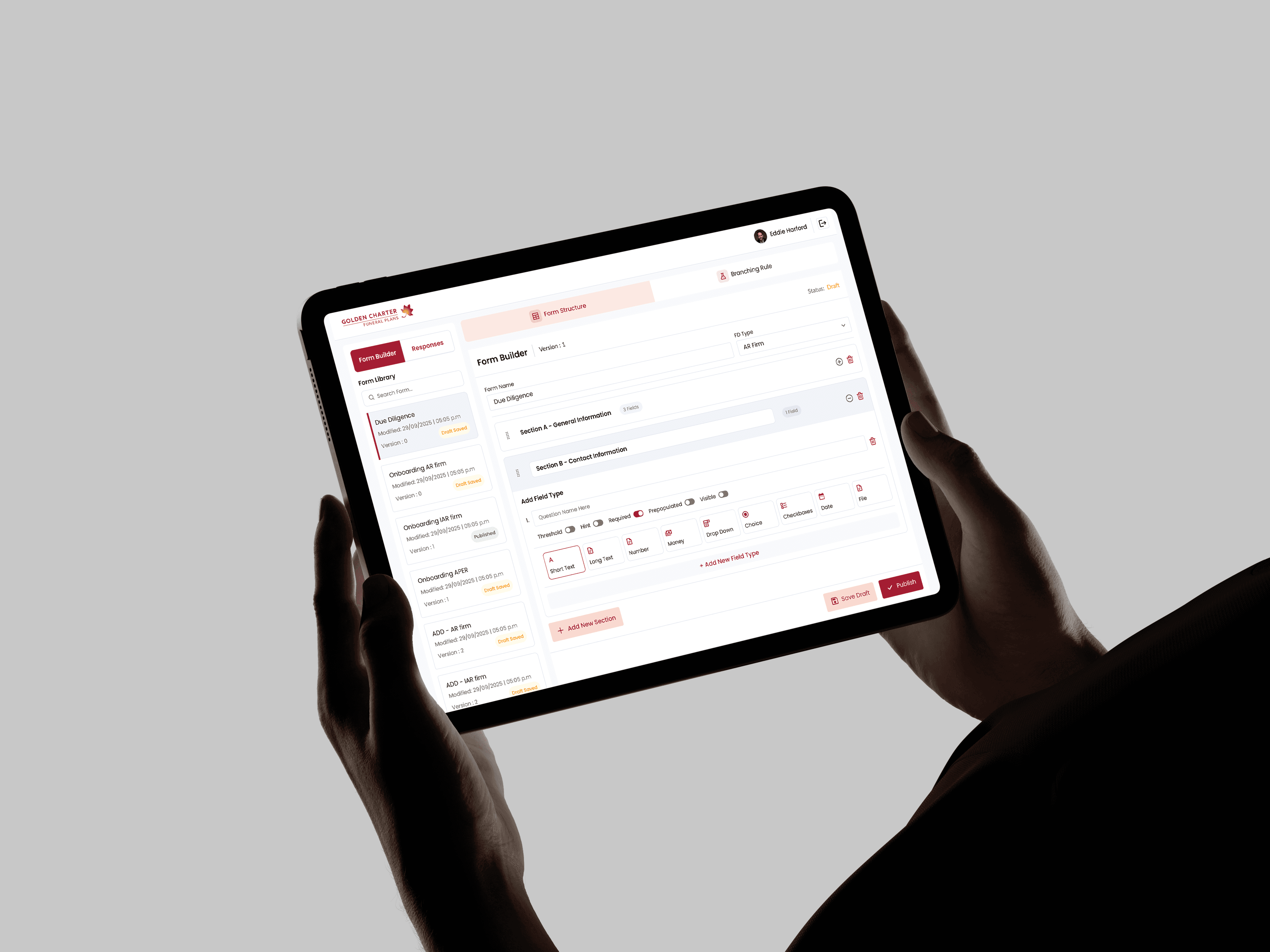 Build a flexible digital form builder that simplifies long-form onboarding, ensures compliance, and provides Golden Charter with a scalable tool for managing multiple partner and due diligence forms.